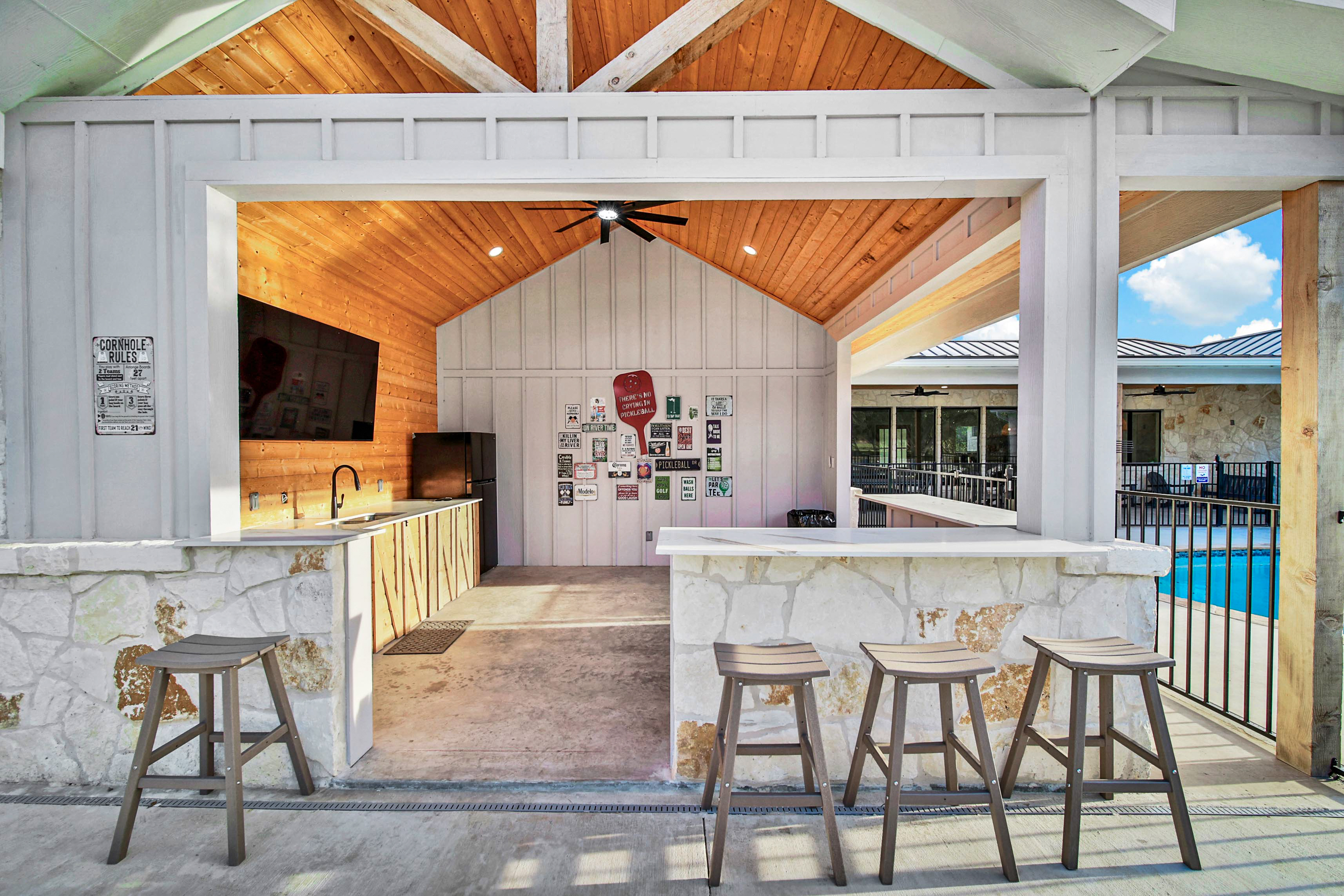 Peak Rate – May 15th – September 15th $850 Non-peak March 1st - May 14th $650 Winter Rate September 16th – February 28th $650 All holidays, spring break will be charged at peak rate. Welcome to the Pickle House – where fun, relaxation, and adventure come together! Nestled in the heart of the breathtaking Concan Country Club Subdivision. This stunning home is an entertainer’s dream! With 5 spacious bedrooms and 5.5 luxurious bathrooms, the Pickle House can comfortably accommodate up to 28 guests – perfect for family gatherings, friend getaways, or any special occasion. The open-concept design ensures everyone can hang out together in style, with a roomy layout that flows seamlessly for endless fun. Step outside and enjoy the fresh air with ample seating in a spacious outdoor area, ideal for relaxing and catching up with friends. Take a refreshing dip in your private pool, or tap into your competitive side on the full-size Pickleball court. For those who prefer a more laid-back competition, there’s always cornhole – and it’s all included in your stay! But wait, there’s more! The Pickle House is offering an exclusive “Stay and Play” package through May of 2026. Enjoy access to the Frio Valley Ranch Golf Club with six rounds of golf per day during your stay(6 golfers), absolutely on the house! Whether you’re a seasoned golf pro or just looking to have some fun on the green, this unbeatable offer adds even more value and excitement to your getaway. The fact that they require booking tee times in advance with Frio Valley Ranch Golf Club adds a level of convenience and ensures that visitors can plan their rounds without worrying about availability. Offering this combination of accommodations and multiple rounds of golf at a popular course could be a solid value for those looking to enjoy both a relaxing stay and quality golfing experience. *Additional guest staying and playing at the rental can be added for a discounted price. Come for the adventure, stay for the memories – the Pickle House is waiting to host you! To help keep the cost of your rental down, we do offer our guest the option to bring their own Linens and Towels. We do offer the option to rent them at an extra cost. If wanting to rent linens and towels for your stay, please allow us 4 weeks prior to arrival notice. Make note that we do have a limited supply and cannot guarantee we will have lines and towels readily available. Bedroom 1- King bed Bedroom 2- 2 Queen beds Bedroom 3- 2 Queen/ queen beds Bedroom 4- 2 Queen/queen beds Bedroom 5-2 Queen, twin/twin What to Bring. LINENS: Bring linens and towels, pillows, blanket/bedspread are provided. TOWELS: Bath towels, washcloths, kitchen towels and pool towels. CHAIRS: Bring folding or sack chairs to take to the river. The chairs at the rental should not be removed from the property. PAPER GOODS: Paper towels, toilet paper, napkins, paper plates, plastic cups, plastic ware. SOAP: Dishwashing, laundry and hygiene products BBQ: There are BBQ cooking utensils, but remember to bring charcoal/lighter/matches. Your kitchen is complete with dinnerware, silverware, glasses, basic cookware, coffee pot, microwave, pots & pans. We provide: • Coffee filters • Daily garbage pick up service We do not provide: • Tall kitchen bags • Paper towels • Hand soap • Shampoo • Dishwashing liquid/powder • Salt & pepper • Toilet Paper NOTE: If it is an all-adult group (18 years +) then ALL GUESTS MUST BE 25 YEARS OR OLDER! This information is located on our “Printable Version” of the Policies & Procedures.